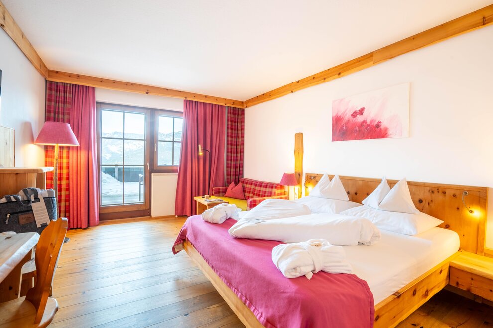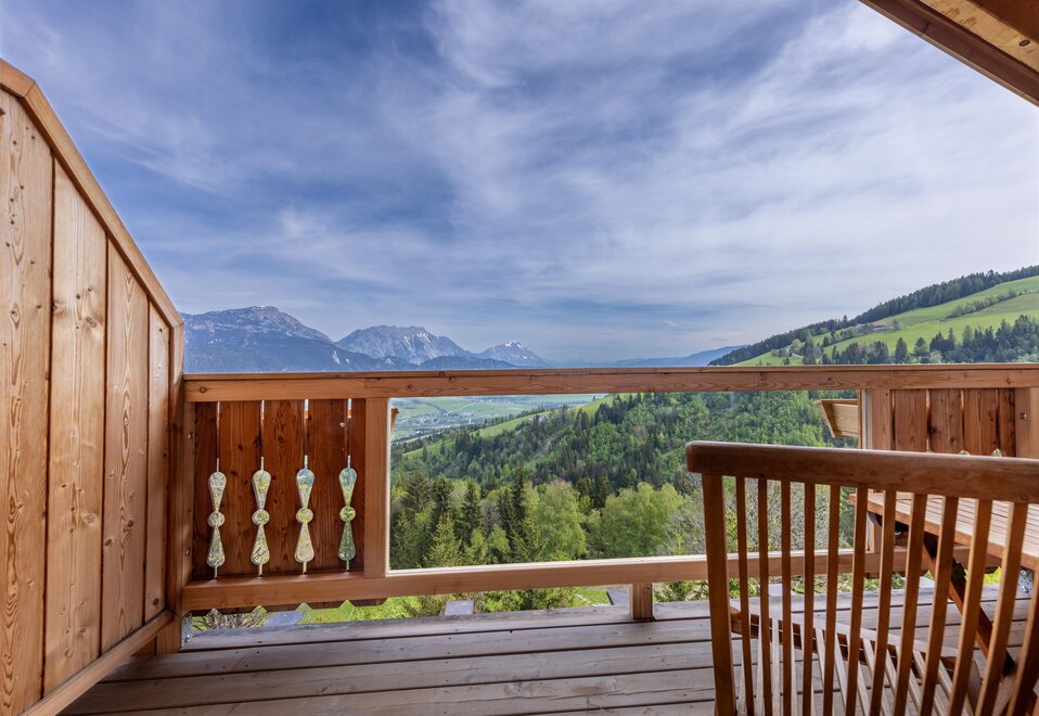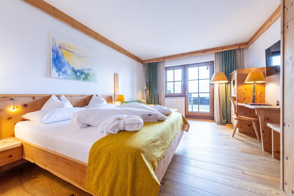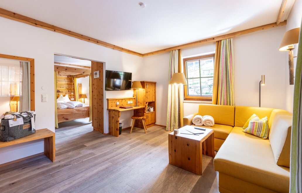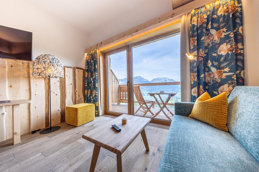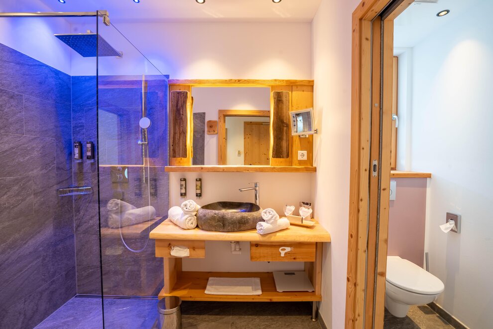 Z tego pokoju można podziwiać zapierający dech w piersiach widok gór w promieniu 180 stopni: widok, gdzie sięga oko - zwłaszcza z narożnego balkonu! Modny alpejski styl z surowym drewnem cisa i starym drewnem, wysokiej jakości materiałami i szlachetnymi detalami sprawia, że ten pokój jest idealną oazą relaksu. W łazience znajdują się solidne drewno i kamień naturalny.
