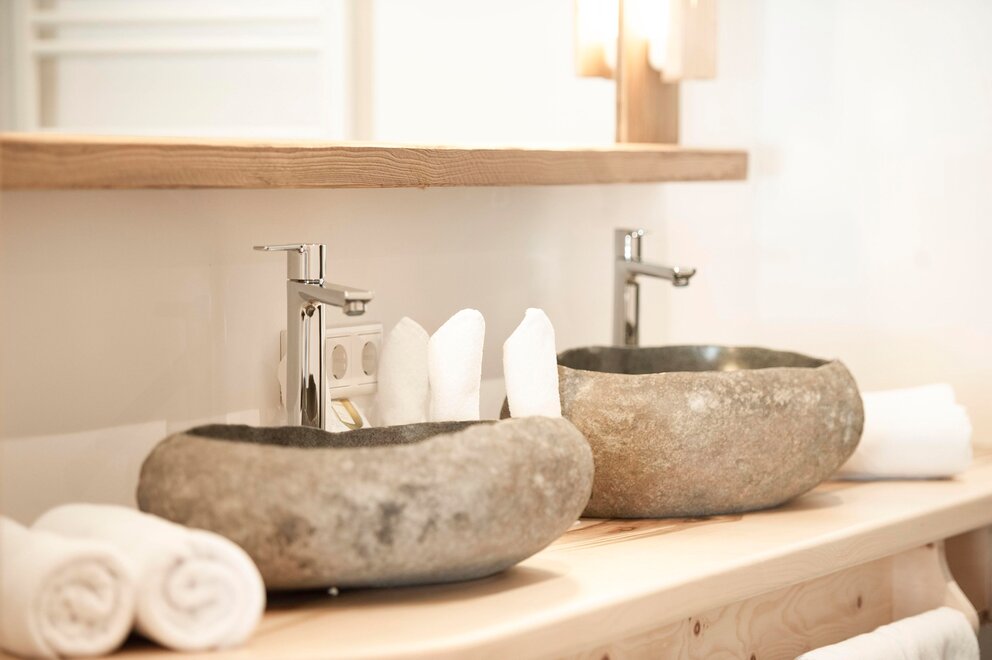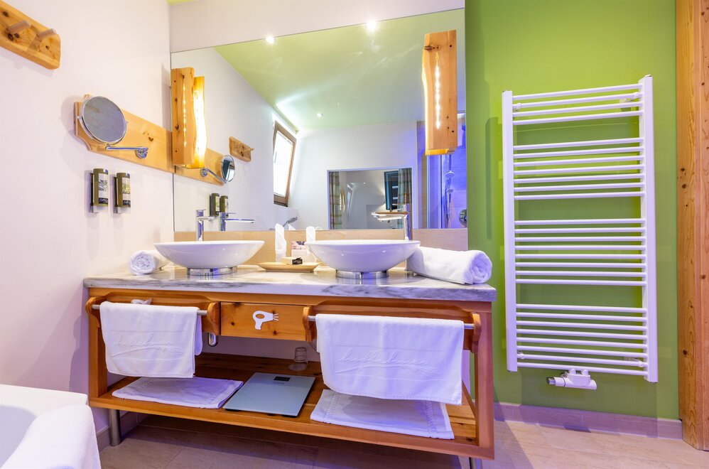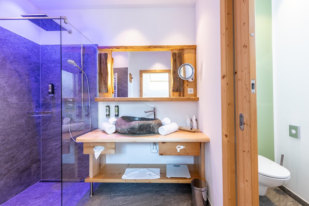 Rodzina oznacza bliskość - ale miło jest też mieć swoją przestrzeń. Dlatego sypialnie w tym apartamencie rodzinnym są oddzielone. Elegancka łazienka wyposażona jest w kamień i szkło, dużą, przeszkloną kabinę prysznicową oraz oddzielną toaletę. Pachnące meble z naturalnego drewna sycomory i przytulny kącik wypoczynkowy nadają pomieszczeniu wyjątkowy charakter. Pokój ma północny balkon z wspaniałym widokiem na imponujący masyw Dachsteinu aż po Gesäuse. Pokój wyposażony jest również w drewnianą podłogę i jest przystosowany dla osób z alergiami.