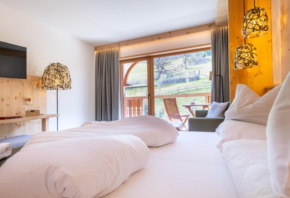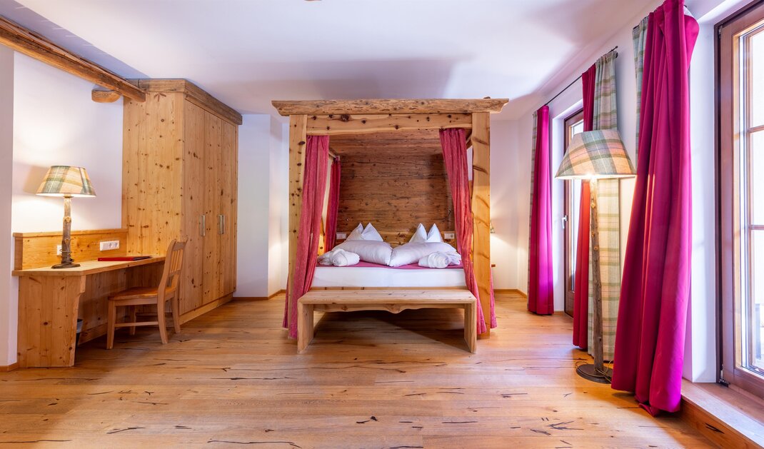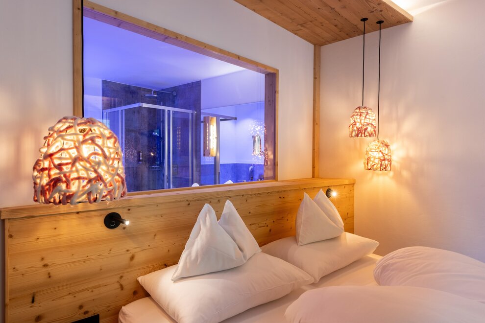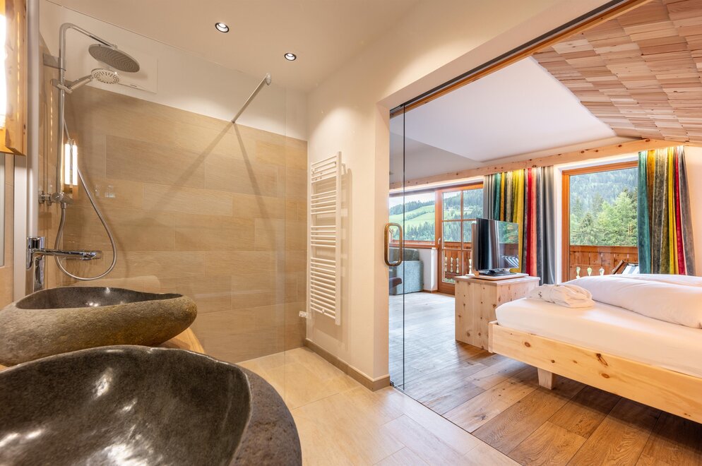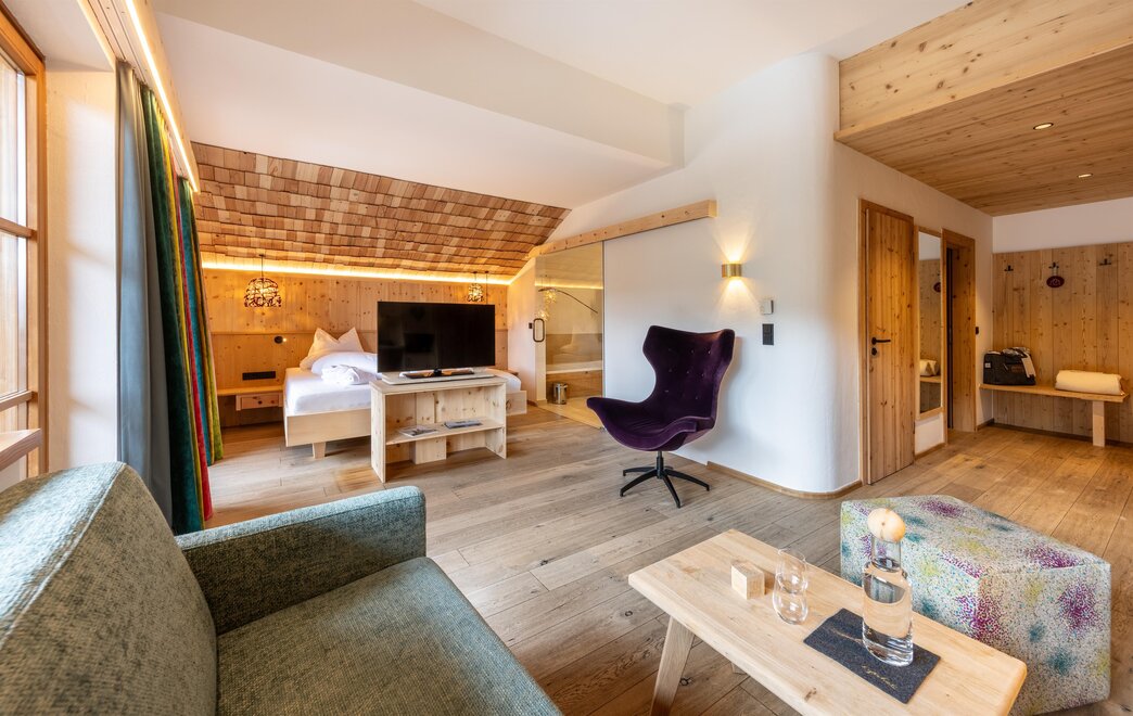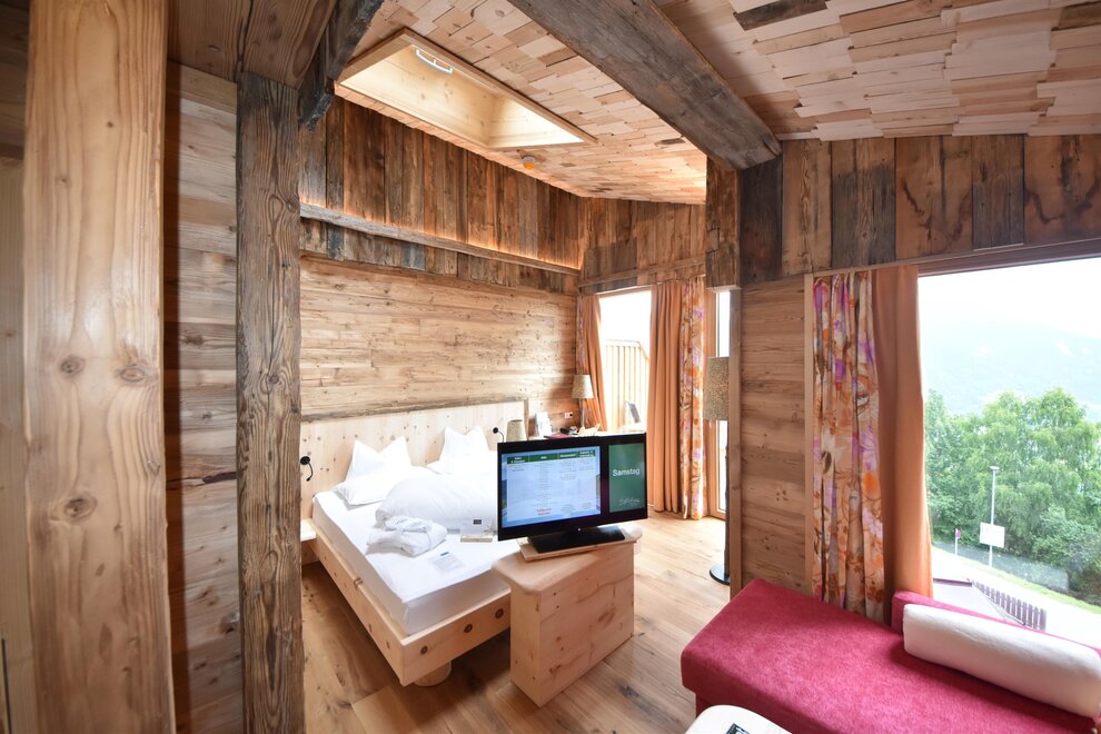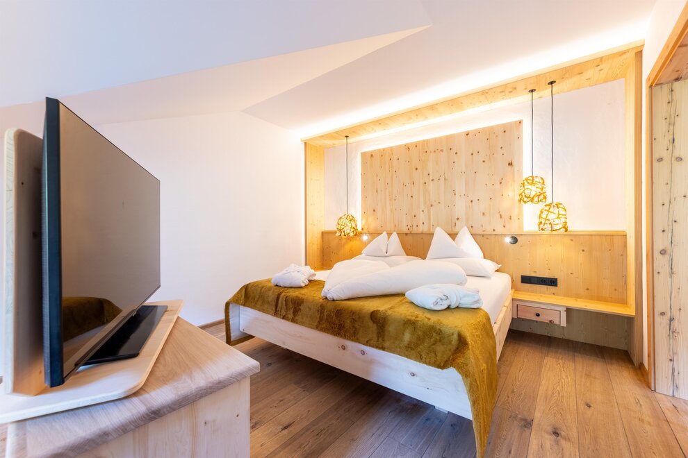 Z tego pokoju rozciąga się zapierający dech w piersiach widok na góry o kącie 180 stopni: Widok, dokąd oko sięgnie! Styl trendy-alpejski z nieobrobionym drewnem cisa i drewnem starszym, wysokiej jakości tkaninami oraz szlachetnymi materiałami sprawia, że ten pokój staje się idealną oazą wypoczynku. W łazience znajdują się solidne drewno i naturalny kamień.