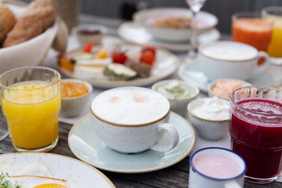 Gourmetowa pensjonat z obfitym bufetem śniadaniowym z świeżo wyciskanymi sokami, kuchnia na żywo, strefa zdrowia i produkty regionalne. Lekkie lunche z zupą, pastami, sałatkami i ciastami na obiad. 6-daniowe menu gourmet z wyborem (ryba, mięso, wegetariańskie, regionalne) na poziomie gwiazd Michelin, w tym bufet sałatkowy.