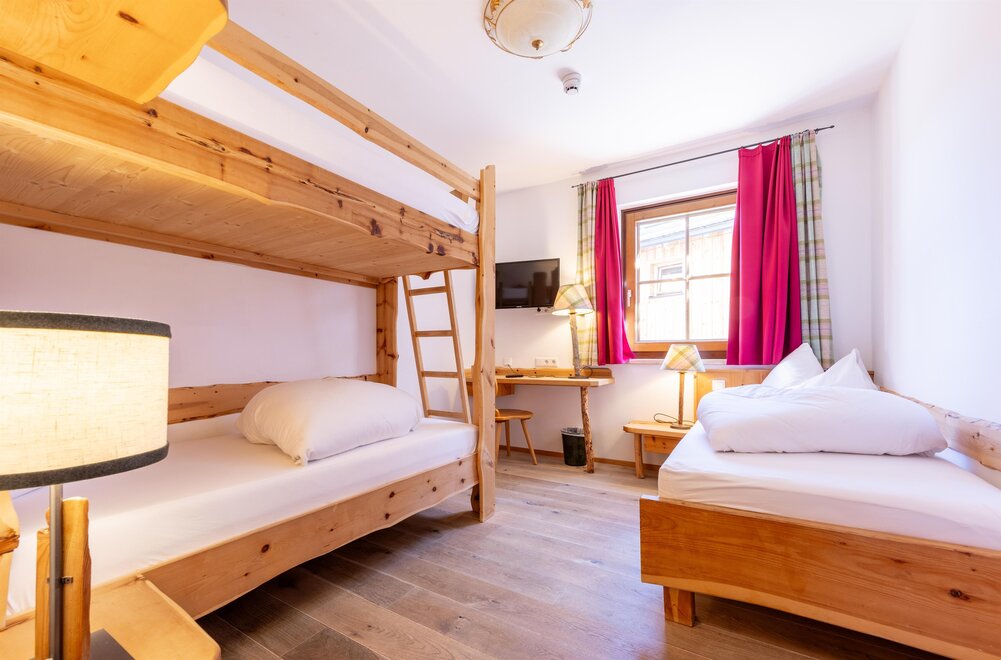 W Almsuite rustykalny, elegancki komfort łączy się z przestronnością. Czeka na Państwa przestrzeń dzienna i sypialna oraz osobna część sypialna z łóżkiem piętrowym dla 3 osób. Panorama natury leży u Państwa stóp. Doświadczcie wschodu i zachodu słońca na własnej skórze! W przestronnej łazience z prysznicem znajdą Państwo także dużą wannę. Toaleta jest oddzielona od łazienki. W przestrzeni dziennej artystycznie malowane obrazy i przytulne koce tworzą przytulną atmosferę. Suite urządzona jest z ręcznie robionych, pachnących mebli z pełnego drewna modrzewiowego oraz rustykalnego starego drewna, posiada dębowe podłogi i jest odpowiednia dla alergików.