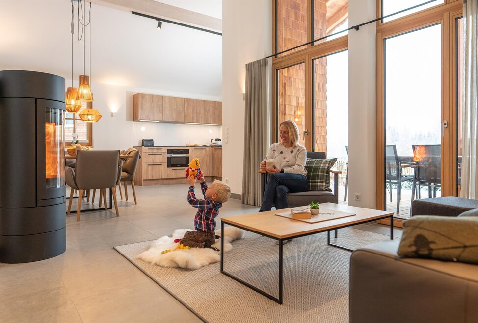 Wszystkie chalety są skierowane na POŁUDNIE, co gwarantuje ich zanurzenie w ciepłym dziennym świetle. Przestronne szklane fronty oraz przestronności wnętrz sięgające 5 m łączą alpejsko-nowoczesne wnętrze z najnowszą technologią.