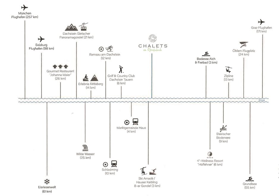 Ekskluzywna lokalizacja naturalnych chaletów przy Gradenbach w Weissenbach koło Haus – otoczonych lasami, łąkami i wodą, osadzona między imponującym masywem Dachstein a Schladminger Tauern z widokiem na Hauser Kaibling, to idealne miejsce na wypoczynek według Państwa upodobań. Bezproblemowo wkomponowane w alpejski krajobraz przyrody, gwarantują wypoczynek w całkowitej wolności. Dla niektórych to park przyrody z wszystkimi jego aspektami, dla innych miejsce oferujące wiele różnorodnych atrakcji przez cały rok w krótkiej odległości.