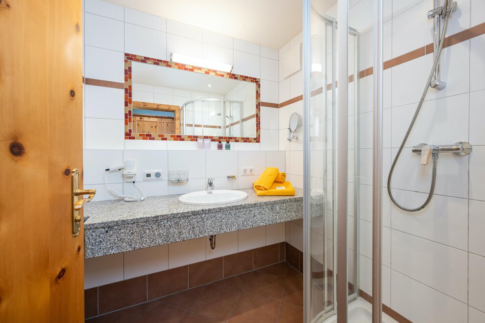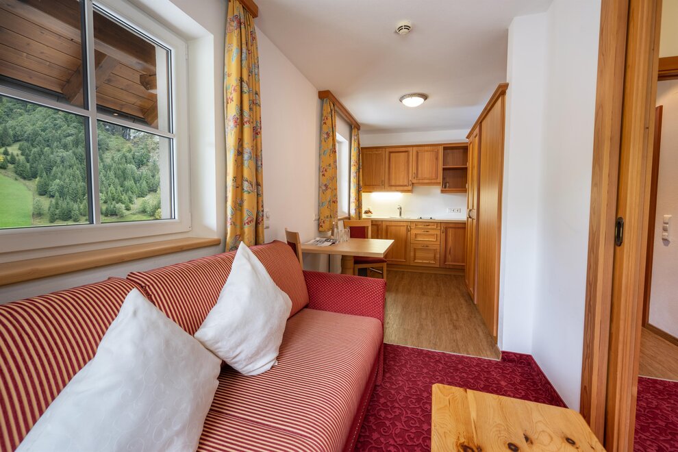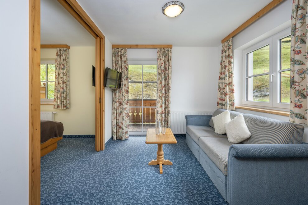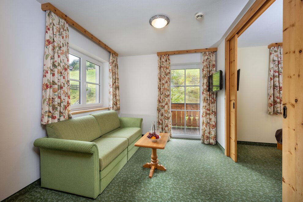 Our elegant comfort room "Security" offers stylish living comfort for 2-4 people – with an open living-sleeping area designed in a warm, alpine atmosphere. Equipped with shower/WC, bathtub, double sink, flat-screen TV, radio, hairdryer, cosmetic mirror, and hotel safe, this room leaves nothing to be desired. The spacious sun terrace invites you to relax with a view of the greenery – ideal for couples or families who want to enjoy space and tranquility.