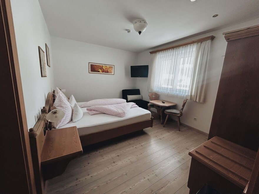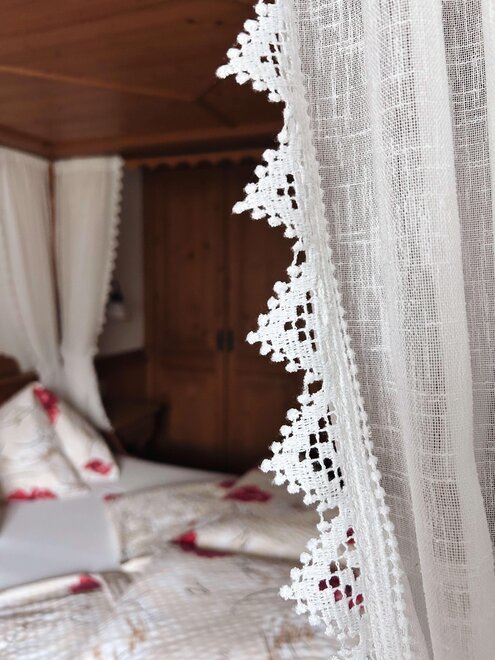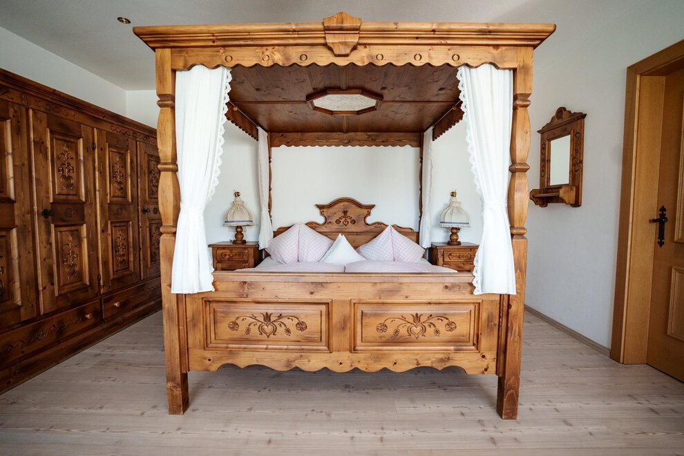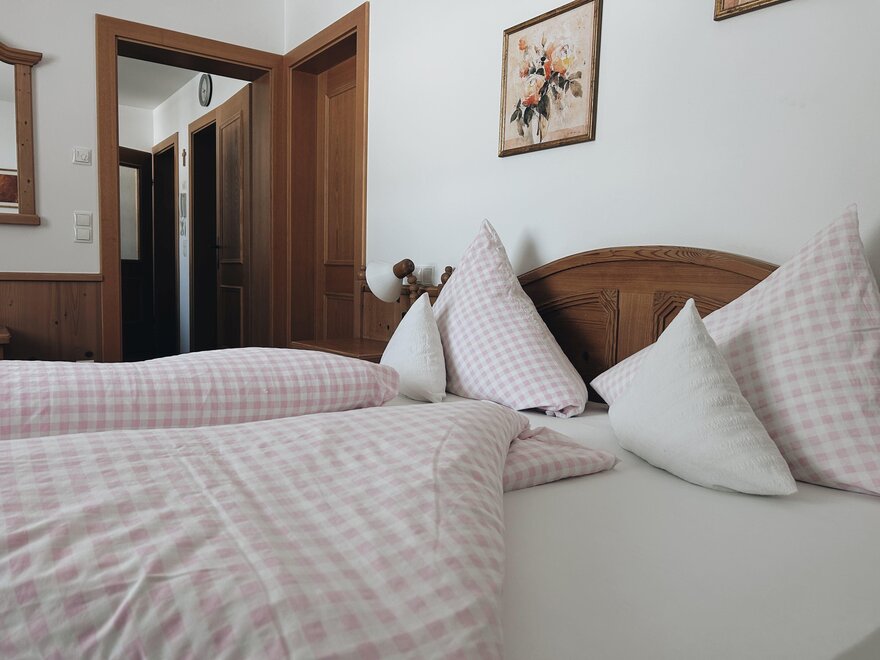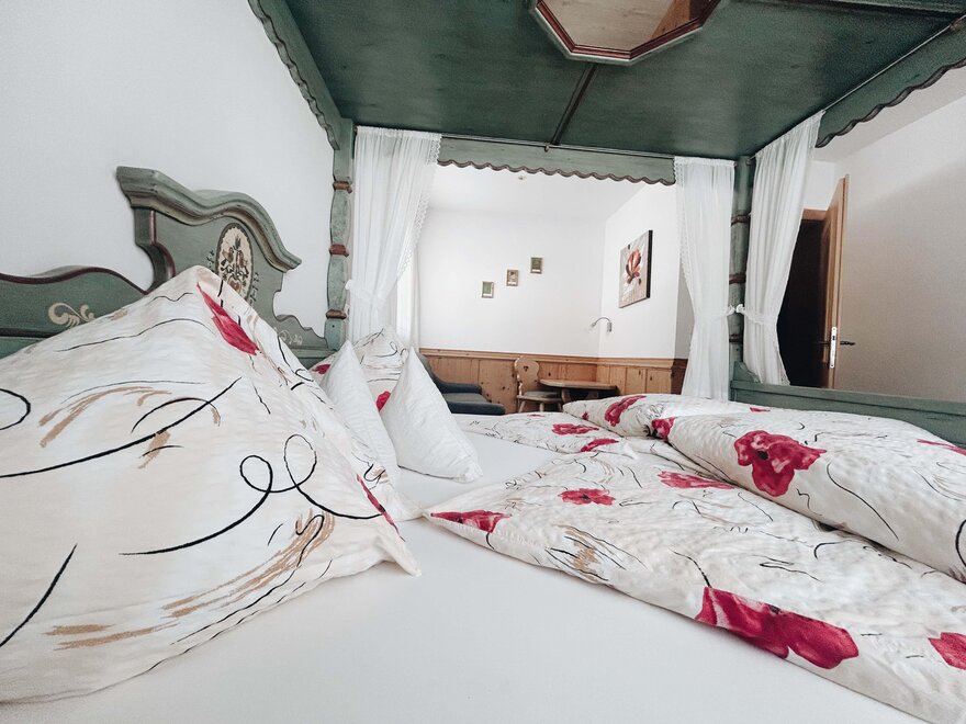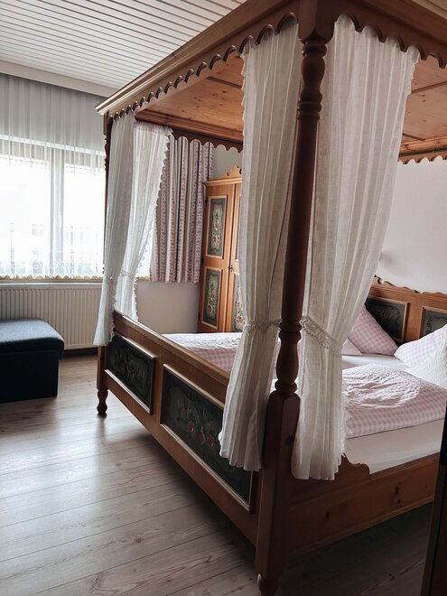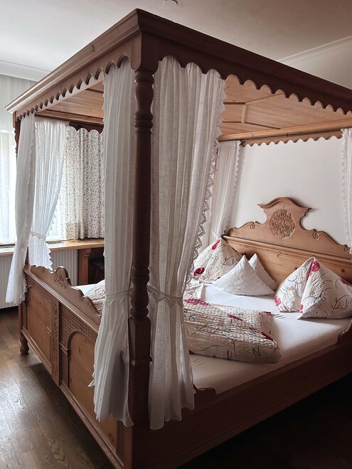 Apartment for 3–4 people, with extra beds for up to 6 people. 2 double rooms (1 with a four-poster bed & pull-out couch), 2 bathrooms with shower/WC, fully equipped kitchen, cozy living area with dining table, 3 flat-screen TVs, WLAN, south-facing balcony with garden view.