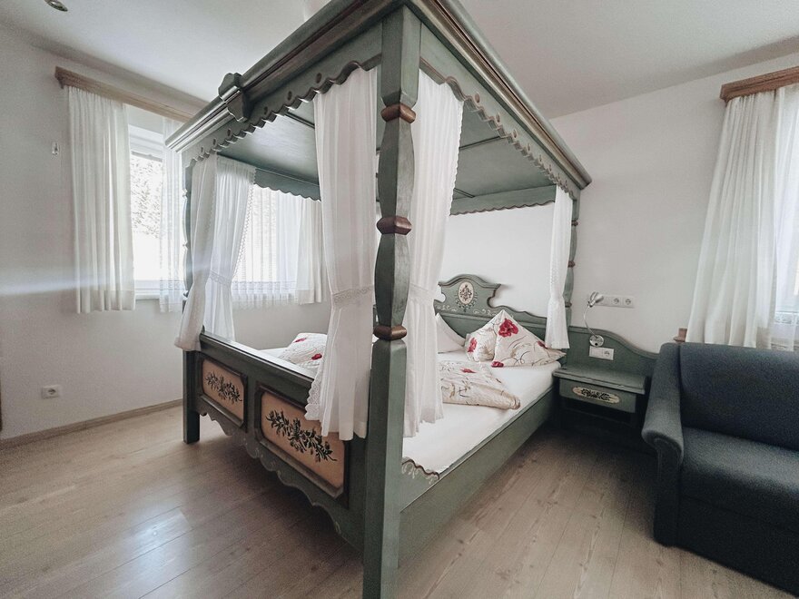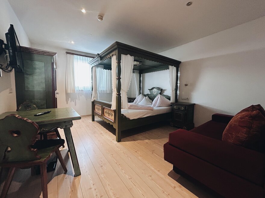 A romantic dooble-room with four-poster bed, couch with shower and WC, Cable/Tv, Radio and breakfast