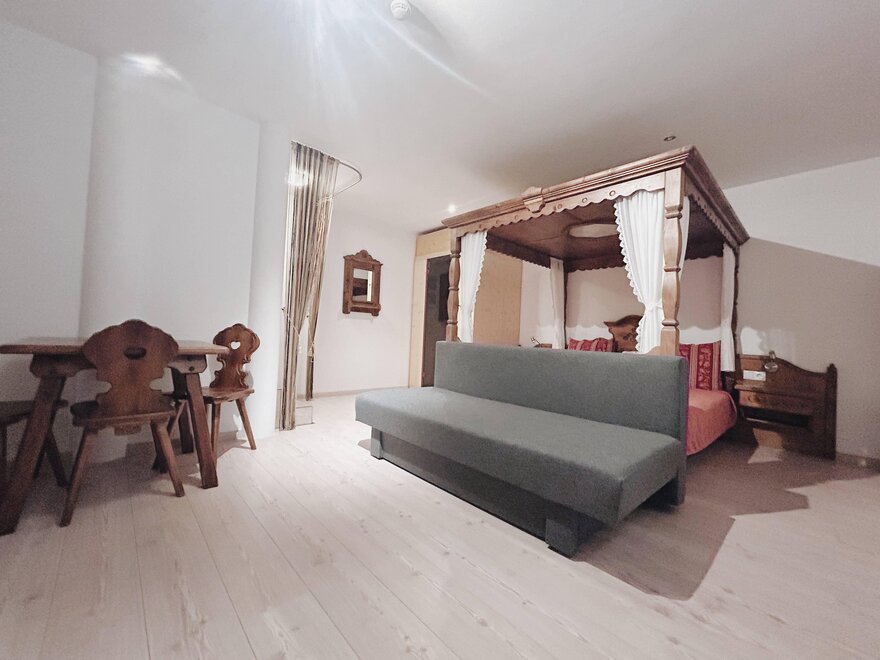 Apartment for 2 people, with extra beds for up to 4 people. Living-sleeping area with a romantic four-poster bed and sofa bed, shower/WC with hairdryer, fully equipped kitchen, cozy dining area, flat-screen TV, and free Wi-Fi.