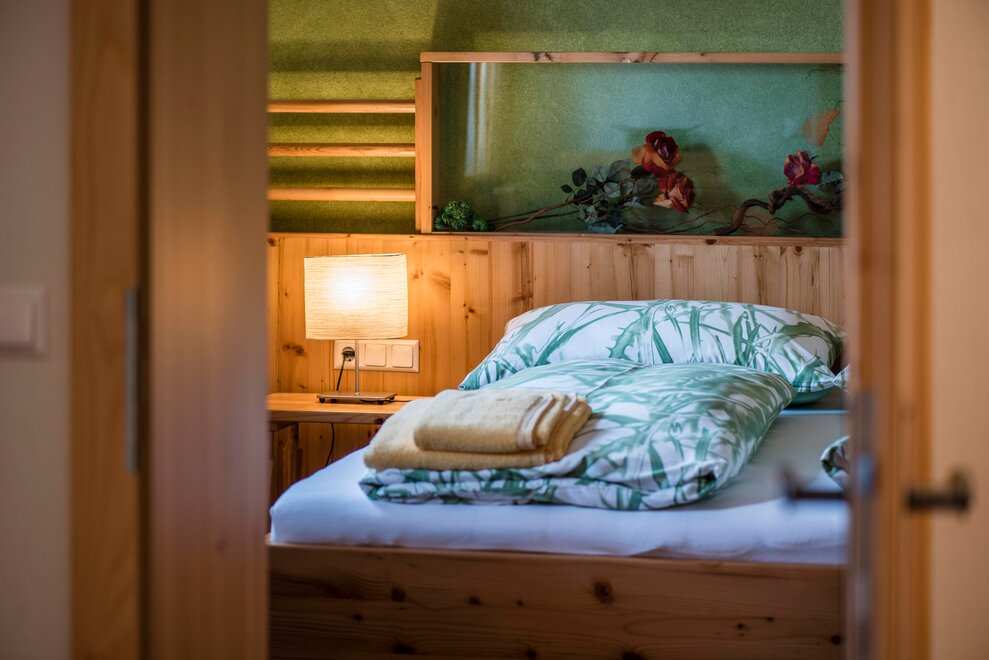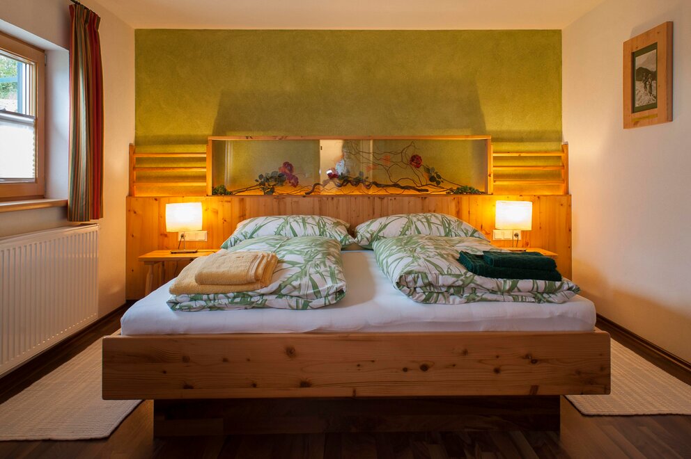 The bedroom is furnished with a romantic double bed, the bathroom with high standards: combined shower/bathtub, toilet, sink, radiator as a towel warmer, and extraordinary fixtures. In the wellness area, there is a Swiss stone pine and old wood sauna, infrared cabin.Ausstattung Zimmer/Appartement