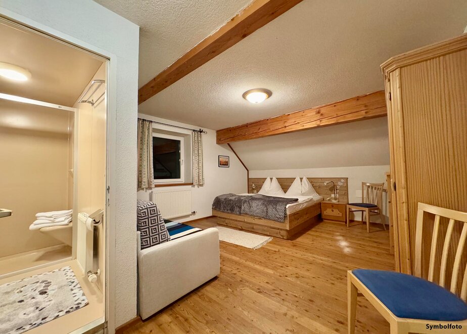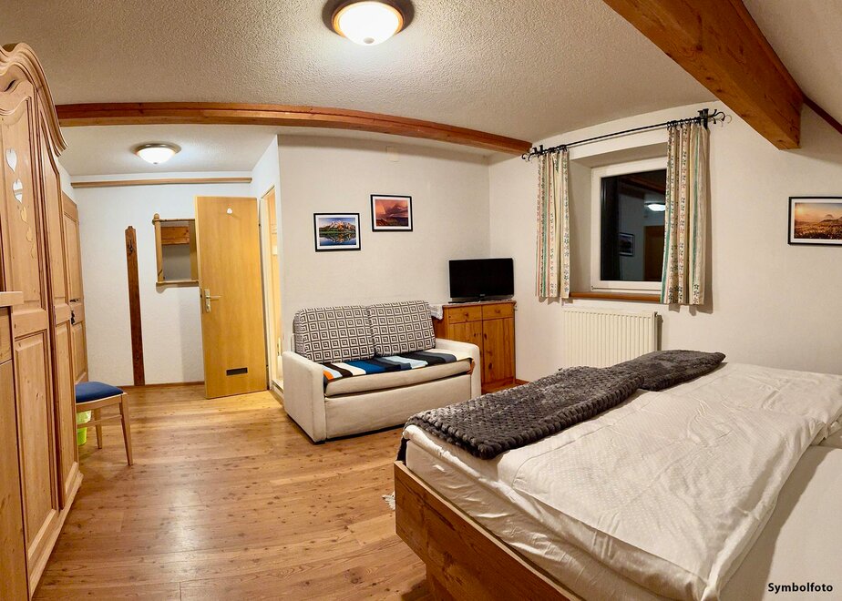 Family room with up to 45 m² size! Shower / WC, TV, kitchen block with 2 hotplates, refrigerator with small freezer, sink, dishes, kettle, filter coffee machine! Sitting area, balcony!