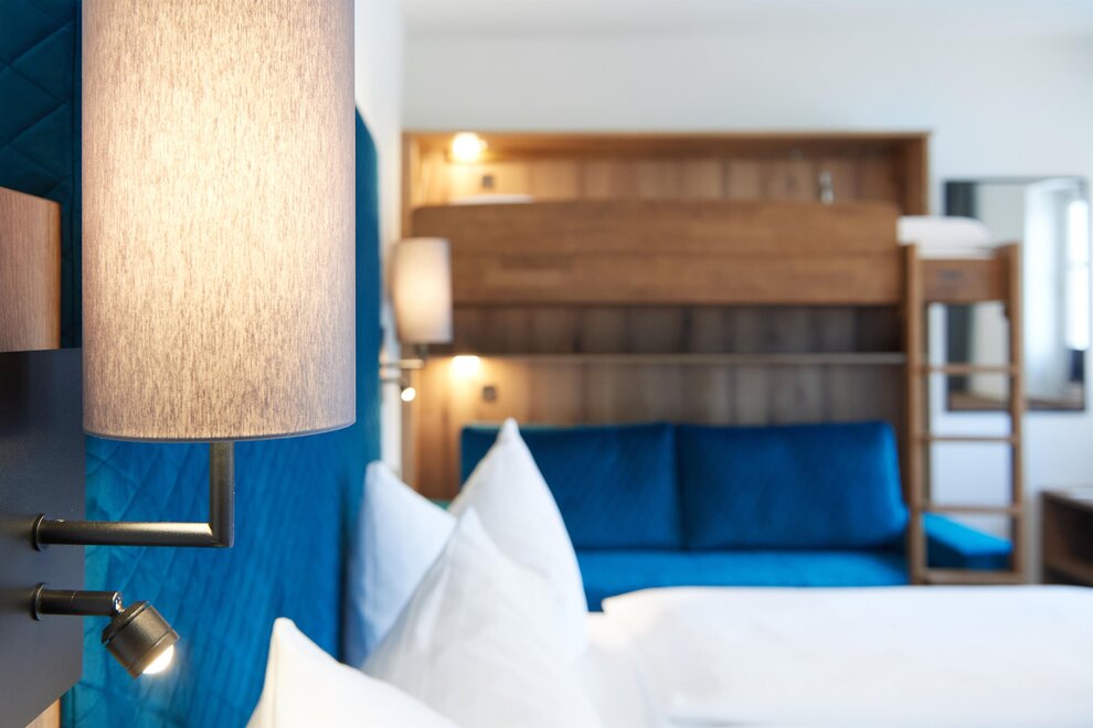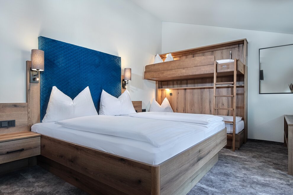 Family suite in the Bird's Nest (55 m²) with two bedrooms, two bathrooms, and a cozy living area that can also be used as an additional sleeping space. Perfect for families looking for comfort and security.