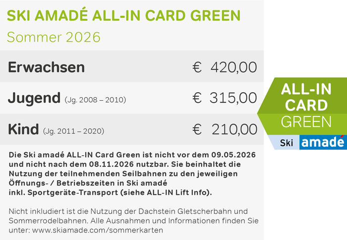Wichtige Information: Die Ski amadé ALL-IN Card Green ist nicht vor dem 09.05.2026 und nicht nach dem 08.11.2026 nutzbar. Sie beinhaltet die Nutzung der teilnehmenden Seilbahnen zu den jeweiligen Öffnungs- / Betriebszeiten in Ski amadé inkl. Sportgeräte-Transport. Nicht inkludiert ist die Nutzung der Dachstein Gletscherbahn und Sommerrodelbahnen.